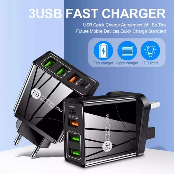 20W PD شاحن QC3.0 متعدد المنافذ USB شاحن جداري للسفر شحن سريع شاحن هاتف محمول 36 واط مخصص